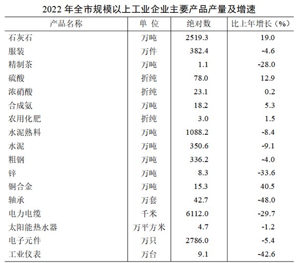 規(guī)模以上工業(yè)統(tǒng)計(jì)的主要產(chǎn)品中,石灰石、硫酸、銅合金、合成氨產(chǎn)量分別增長19%、12.9%、40.5%、5.3%,水泥、粗鋼分別下降9.1%、4%。
