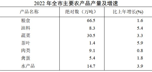 全年糧食產(chǎn)量66.5萬噸,比上年增長1.6%;油料產(chǎn)量8.3萬噸,增長5.4%;棉花產(chǎn)量0.08萬噸,下降25.3%;蔬菜產(chǎn)量30.5萬噸,增長3.3%;茶葉產(chǎn)量1.4萬噸,增長5.9%;肉類總產(chǎn)量9.1萬噸,增長0.8%;禽蛋產(chǎn)量5.4萬噸,增長1.8%;水產(chǎn)品產(chǎn)量14.7萬噸,增長3.9%。