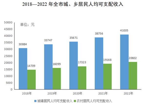 全年常住居民人均可支配收入30964元,比上年增長6.9%。居民人均消費(fèi)支出17912元,增長3.9%。居民恩格爾系數(shù)為33.2%。按常住地分,城鎮(zhèn)居民人均可支配收入41035元,比上年增長5.9%;城鎮(zhèn)居民人均消費(fèi)支出20377元,增長4.9%;城鎮(zhèn)常住居民恩格爾系數(shù)為33.1%。農(nóng)村居民人均可支配收入20602元,比上年增長7.5%;人均消費(fèi)支出15376元,增長0.7%;農(nóng)村常住居民恩格爾系數(shù)為33.4%。