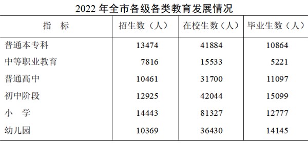 年末全市共有普通高等教育學(xué)校3所,普通本專科在校學(xué)生41884人,成人在校學(xué)生11028人。中等職業(yè)教育學(xué)校6所,在校學(xué)生15533人。普通中學(xué)99所,在校學(xué)生73744人。其中,高中在校學(xué)生31700人,高中階段毛入學(xué)率98.89%;初中在校學(xué)生42044人,初中學(xué)齡人口毛入學(xué)率107.83%。小學(xué)154所,在校學(xué)生81327人,小學(xué)毛入學(xué)率103.01%。
