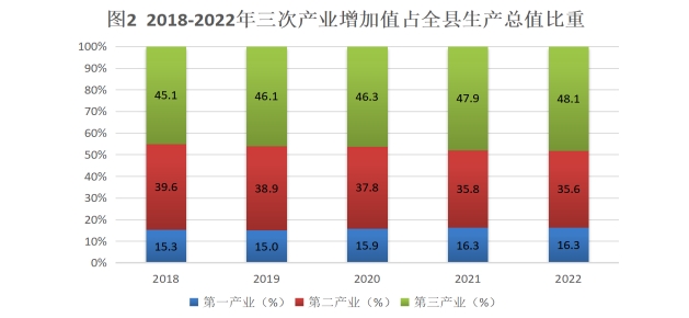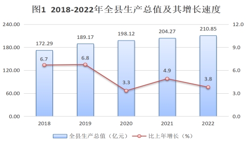 初步核算,2022年全縣生產(chǎn)總值(GDP)210.85億元,按可比價格計算,比上年增長3.8%。其中:第一產(chǎn)業(yè)增加值34.41億元,增長3.7%;第二產(chǎn)業(yè)增加值74.99億元,增長5.3%;第三產(chǎn)業(yè)增加值101.45億元,增長2.7%。三次產(chǎn)業(yè)結(jié)構(gòu)由上年的16.3:35.8:47.9調(diào)整為16.3:35.6:48.1,其中工業(yè)增加值占GDP比重為25.4%。