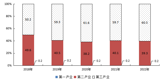圖2:2018-2022年三次產(chǎn)業(yè)增加值占地區(qū)生產(chǎn)總值比重