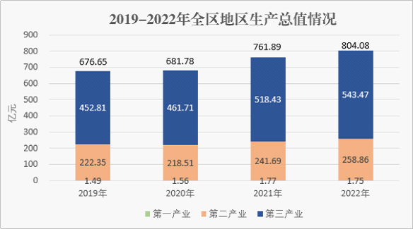 經(jīng)濟總量再上新臺階。2022年全區(qū)生產(chǎn)總值實現(xiàn)804.08億元,同比增長5.5%。其中,第一產(chǎn)業(yè)增加值實現(xiàn)1.75億元,同比增長2.1%;第二產(chǎn)業(yè)增加值實現(xiàn)258.86億元,同比增長6.1%;第三產(chǎn)業(yè)增加值實現(xiàn)543.47億元,同比增長5.2%。三次產(chǎn)業(yè)比例為:0.2:32.2:67.6。