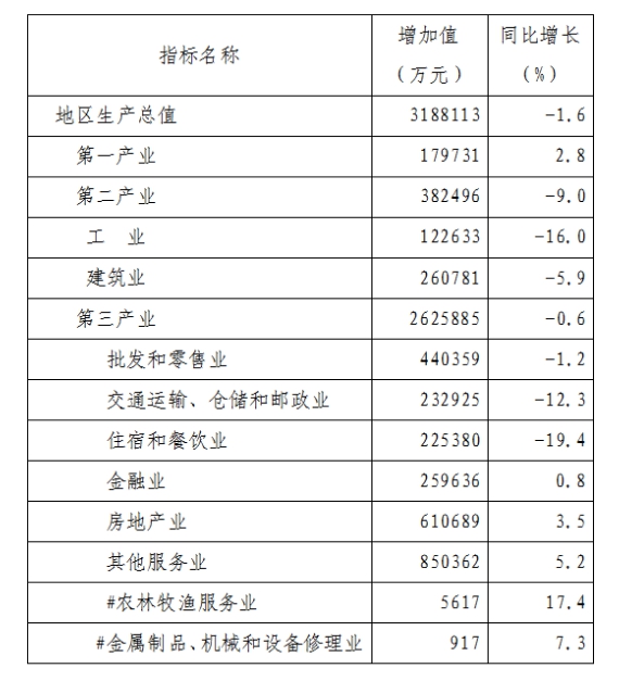 人民生活。全體居民可支配收入40423元,同比下降1.1%。其中:城鎮(zhèn)居民人均可支配收入43911元,同比下降1.8%;農(nóng)村居民人均可支配收入21448元,同比增長(zhǎng)3.9%。
