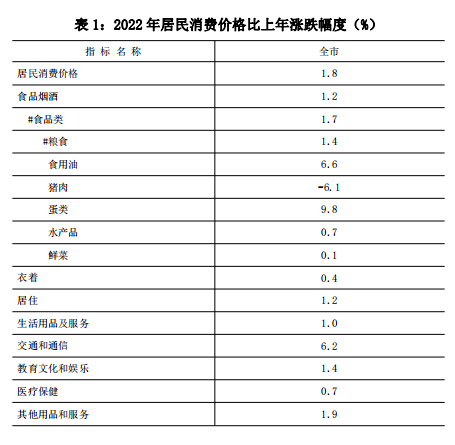 全年居民消費價格(CPI)比上年上漲1.8%,其中食品類價格上漲1.7%,居住類價格上漲1.2%。商品零售價格比上年上漲2.7%。