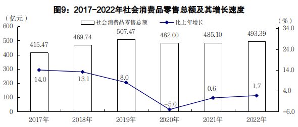 全年社會消費品零售總額493.39億元,比上年增長1.7%。