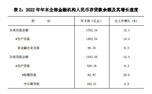 年末金融機構(gòu)人民幣存款余額1792.34億元,比上年末增長12.3%。其中,住戶存款1492.55億元,增長14.4%。貸款余額1182.59億元,增長12.4%。其中,住戶貸款529.18億元,增長8.3%。