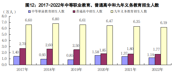 年末有幼兒園299所,在園幼兒78346人,專任教師5339人。有普通小學(xué)學(xué)校182所,小學(xué)教學(xué)點897個,全年招生29066人,在校生186806人,畢業(yè)生32592人,專任教師15579人。小學(xué)學(xué)齡兒童凈入學(xué)率和升學(xué)率均為100%,小學(xué)輟學(xué)率0%。有普通初中學(xué)校174所,全年招生32827人,在校生99807人,畢業(yè)生33054人,專任教師9848人。初中學(xué)齡人口凈入學(xué)率100%,輟學(xué)率0%,升學(xué)率99.6%,三年鞏固率99.7%,九年義務(wù)教育鞏固率99.7%。有普通高中學(xué)校43所,全年招生17655人,在校生54993人,畢業(yè)生24813人,專任教師5484人。高中階段毛入學(xué)率96.0%,輟學(xué)率0.2%,升學(xué)率88.7%。有中等職業(yè)教育學(xué)校9所,全年招生11888人,在校生33568人,畢業(yè)生7296人,專任教師1621人。有特殊教育學(xué)校5所,全年招生96人,在校生781人,畢業(yè)生90人,專任教師143人。