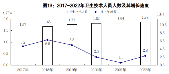 年末共有衛(wèi)生技術(shù)人員18829人,比上年增長2.8%。其中執(zhí)業(yè)醫(yī)師5382人、執(zhí)業(yè)助理醫(yī)師1857人、注冊護師護士7938人、藥師(士)747人、技師(士)1137人、其他衛(wèi)技人員1511人。