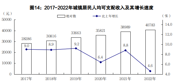 全年城鎮(zhèn)居民人均可支配收入40783元,比上年增長4.6%。城鎮(zhèn)居民人均消費支出24507元,增長4.4%。城鎮(zhèn)居民恩格爾系數(shù)39.6%,與上年持平。