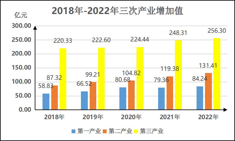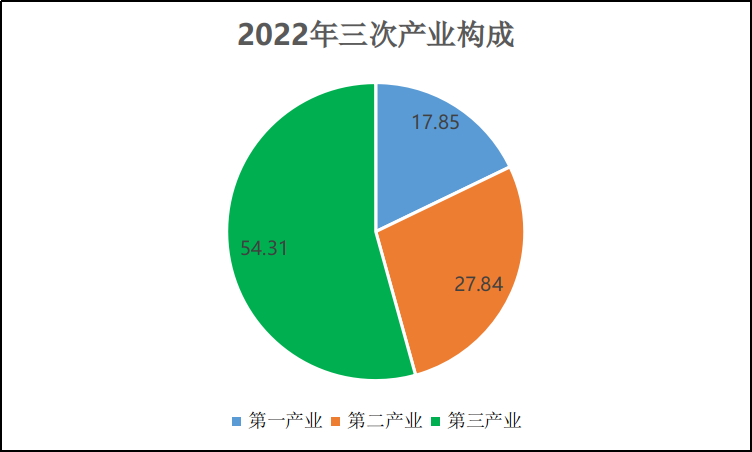 三次產(chǎn)業(yè)占GDP的比重由2021年的17.75:26.70:55.55調(diào)整為2022年的17.85:27.84:54.31。三次產(chǎn)業(yè)分別拉動(dòng)GDP增長(zhǎng)0.8個(gè)、1.5個(gè)和1.2個(gè)百分點(diǎn);三次產(chǎn)業(yè)增加值對(duì)GDP增長(zhǎng)的貢獻(xiàn)率分別為22.83%、43.76%和33.41%。