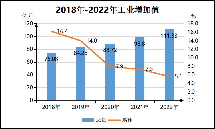 全年全部工業(yè)增加值達(dá)到111.33億元,同比增長(zhǎng)5.6%;拉動(dòng)GDP增長(zhǎng)1.2個(gè)百分點(diǎn);占GDP的比重達(dá)到23.6%。其中,采礦業(yè)增加值19.47億元,增長(zhǎng)12.9%;制造業(yè)增加值6.59億元,下降2.5%;電力、熱力、燃?xì)饧八a(chǎn)和供應(yīng)業(yè)增加值85.26億元,增長(zhǎng)5.0%。