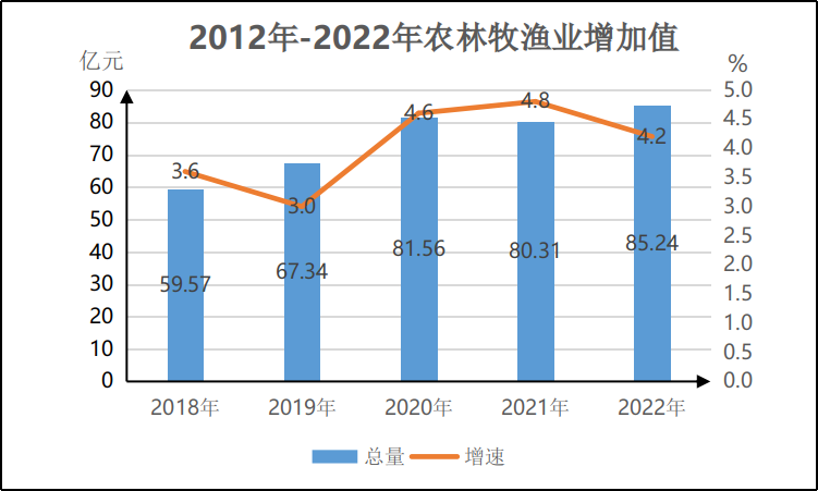農(nóng)林牧漁業(yè)實(shí)現(xiàn)總產(chǎn)值(現(xiàn)價(jià))127.46億元,同比增長(zhǎng)4.3%。其中,農(nóng)業(yè)產(chǎn)值52.32億元,增長(zhǎng)5.1%;林業(yè)產(chǎn)值2.98億元,增長(zhǎng)28.3%;牧業(yè)產(chǎn)值70.53億元,增長(zhǎng)4.2%;農(nóng)林牧漁服務(wù)業(yè)產(chǎn)值1.62億元,增長(zhǎng)9.5%。實(shí)現(xiàn)農(nóng)林牧漁業(yè)增加值85.24億元,增長(zhǎng)4.2%。