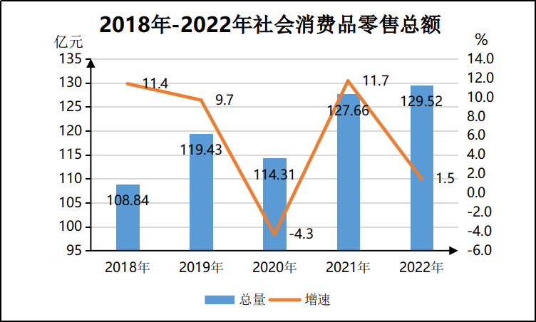 實(shí)現(xiàn)社會(huì)消費(fèi)品零售總額129.52億元,同比增長(zhǎng)1.5%。按經(jīng)營(yíng)地分,城鎮(zhèn)消費(fèi)品零售額94.92億元,增長(zhǎng)1.7%;鄉(xiāng)村消費(fèi)品零售額34.60億元,增長(zhǎng)0.9%。按消費(fèi)類型分,商品零售額95.35億元,增長(zhǎng)2.8%;餐飲收入34.18億元,下降2.2%。