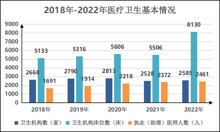 醫(yī)療衛(wèi)生機(jī)構(gòu)實(shí)有床位8130張。其中,各類醫(yī)院有床位6044張,婦幼保健機(jī)構(gòu)有床位375張,衛(wèi)生院有床位1707張,社區(qū)服務(wù)中心4張。衛(wèi)生技術(shù)人員7628人,其中執(zhí)業(yè)醫(yī)師和執(zhí)業(yè)助理醫(yī)師2461人,注冊(cè)護(hù)士2529人。