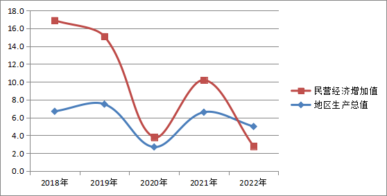 2022年民營(yíng)經(jīng)濟(jì)實(shí)現(xiàn)增加值3707817萬元,按可比價(jià)格計(jì)算,同比增長(zhǎng)-2.2%。其中,第一產(chǎn)業(yè)增加值193961萬元,增長(zhǎng)4.3%;第二產(chǎn)業(yè)增加值2038978萬元,增長(zhǎng)-0.2%;第三產(chǎn)業(yè)增加值1474878萬元,增長(zhǎng)-5.4%。民營(yíng)經(jīng)濟(jì)增加值占地區(qū)生產(chǎn)總值的比重為55.16%。