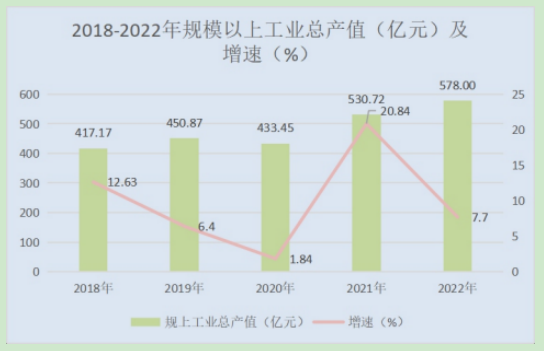 全年規(guī)模以上工業(yè)平穩(wěn)增長,截至2022年末全市規(guī)模以上工業(yè)企業(yè)在庫153戶 (不含軍工),其中新增規(guī)模以上企業(yè)16戶。全市規(guī)模以上工業(yè)總產(chǎn)值完成578.00億元(不含軍工),同比增長7.7%;規(guī)上工業(yè)增加值增速5.4%,較上年同期下降9個百分點。