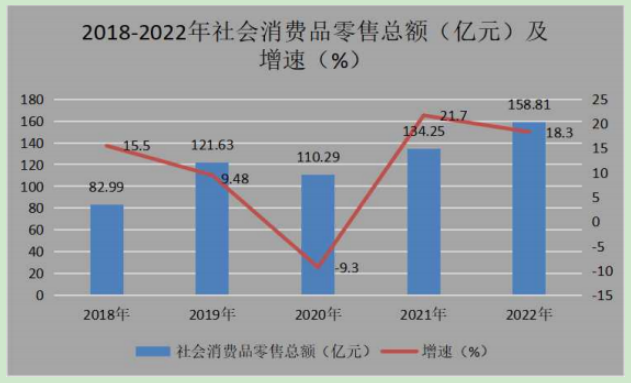 2022年限額以上商貿(mào)在庫企業(yè)139戶,其中,新增限額以上商貿(mào)企業(yè)15戶。全社會消費品零售總額158.81億元,同比增長18.3%。其中,限額以上單位消費品零售額112.22億元,同比增長29.9%,占社會消費品零售總額的70.7% 。從行業(yè)劃分來看,全社會批發(fā)貿(mào)易零售總額為15.48億元,同比增長4.5%;零售貿(mào)易完成111.6億元,同比增長20.8%;住宿業(yè)完成2.58億元,同比增長5.4%;餐飲業(yè)完成29.15億元,同比增長18.6%。