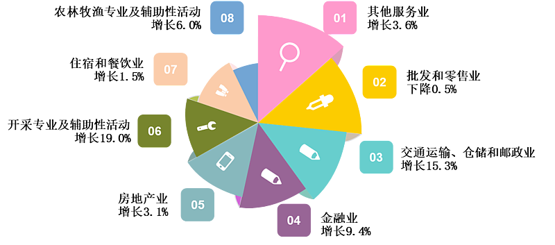 全市服務(wù)業(yè)增加值增長(zhǎng)5.5%。從主要行業(yè)看:批發(fā)和零售業(yè)下降0.5%,交通運(yùn)輸、倉(cāng)儲(chǔ)和郵政業(yè)增長(zhǎng)15.3%,住宿和餐飲業(yè)增長(zhǎng)1.5%,金融業(yè)增長(zhǎng)9.4%,房地產(chǎn)業(yè)增長(zhǎng)3.1%,其他服務(wù)業(yè)增長(zhǎng)3.6%。