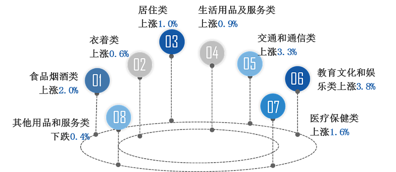 據(jù)寶塔區(qū)調(diào)查點(diǎn)數(shù)據(jù)顯示:居民消費(fèi)價(jià)格同比上漲1.9%。八大類(lèi)呈“七升一降”:居住上漲1.0%、交通和通信上漲3.3%、醫(yī)療保健上漲1.6%、教育文化娛樂(lè)上漲3.8%、生活用品及服務(wù)上漲0.9%、食品煙酒上漲2.0%、衣著上漲0.6%,其他用品和服務(wù)下跌0.4%。