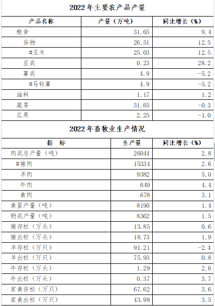 全年糧食播種面積104.4萬畝,同比增長(zhǎng)0.3%。其中,玉米65.79萬畝,增長(zhǎng)3.3%;馬鈴薯23.42萬畝,下降6.1%。油料種植面積6.97萬畝,同比增長(zhǎng)1.3%;蔬菜種植面積15.25萬畝,同比下降1.1%。