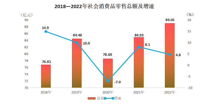 全年社會(huì)消費(fèi)品零售總額89.05億元,同比增長(zhǎng)4.8%。其中,限額以上社會(huì)消費(fèi)品零售額實(shí)現(xiàn)19.85億元,同比增長(zhǎng)7.9%。按經(jīng)營(yíng)地分,城鎮(zhèn)實(shí)現(xiàn)消費(fèi)品零售額60.32億元,增長(zhǎng)5.9%;鄉(xiāng)村實(shí)現(xiàn)消費(fèi)品零售額28.73億元,增長(zhǎng)2.7%。按消費(fèi)形態(tài)分,實(shí)現(xiàn)商品零售額85.48億元,增長(zhǎng)5.2%;餐飲收入3.57億元,下降3.6%。