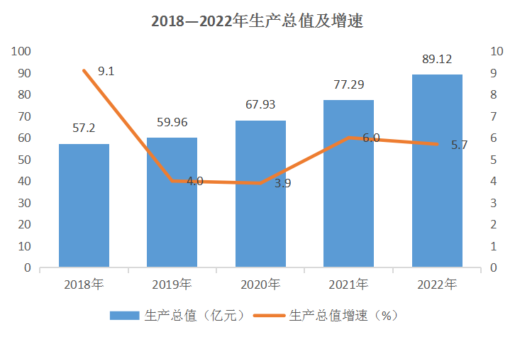 根據(jù)地區(qū)生產(chǎn)總值統(tǒng)一核算初步反饋結(jié)果,2022年,全縣實(shí)現(xiàn)地區(qū)生產(chǎn)總值(GDP)89.12億元,較上年增長5.7%。其中,第一產(chǎn)業(yè)增加值21.46億元,同比增長4.3%;第二產(chǎn)業(yè)增加值30.50億元,同比增長8.1%;第三產(chǎn)業(yè)增加值37.16億元,同比增長5.1%。三次產(chǎn)業(yè)結(jié)構(gòu)比為24.1:34.2:41.7。非公有制經(jīng)濟(jì)增加值完成43.47億元,占生產(chǎn)總值的比重為48.8%。