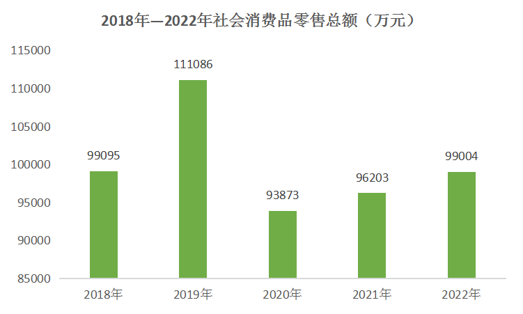 2022年,全縣完成社會(huì)消費(fèi)品零售總額9.90億元,較上年增長2.9%。其中,批發(fā)業(yè)1.85億元,增長1.0%;零售業(yè)6.33億元,增長5.6%;住宿業(yè)0.82億元,增長8.3%;餐飲業(yè)0.90億元,下降2.4%。