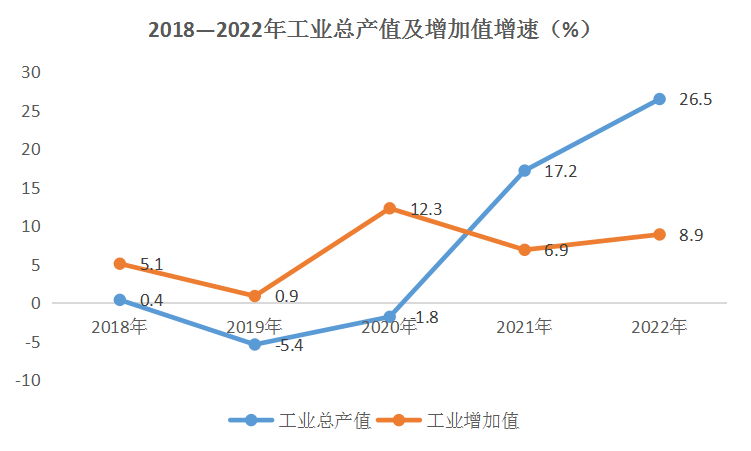 2022年,全縣累計(jì)完成工業(yè)總產(chǎn)值56.74億元,較上年增長26.5%。其中,規(guī)模以上工業(yè)產(chǎn)值51.02億元,增長30.1%;規(guī)模以下工業(yè)產(chǎn)值5.72億元,增長0.5%。完成工業(yè)銷售產(chǎn)值55.72億元,較上年增長24.6%。其中,規(guī)模以上工業(yè)銷售產(chǎn)值50.03億元,增長27.9%;規(guī)模以下工業(yè)銷售產(chǎn)值5.70億元,增長0.5%。全縣實(shí)現(xiàn)工業(yè)增加值27.31億元,較上年增長8.9%。其中,規(guī)模以上工業(yè)增加值24.29億元,增長20.3%;規(guī)模以下工業(yè)增加值3.02億元,增長0.5%。