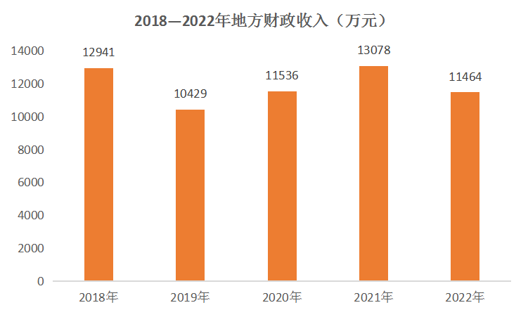 2022年,全縣實(shí)現(xiàn)財(cái)政總收入3.28億元,較上年下降11.1%。其中,地方財(cái)政收入1.15億元,下降12.2%。財(cái)政支出32.19億元,較上年增長10.0%。