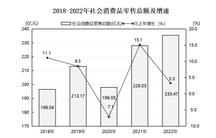 實(shí)現(xiàn)社會消費(fèi)品零售總額235.47億元,同比增長3.3%。從企業(yè)經(jīng)營地看,城鎮(zhèn)消費(fèi)品零售額218.98億元,同比增長3.0%;鄉(xiāng)村消費(fèi)品零售額16.49億元,同比增長6.3%。從消費(fèi)形態(tài)看,餐飲收入25.45億元,同比增長0.1%;商品零售210.02億元,同比增長3.7%。