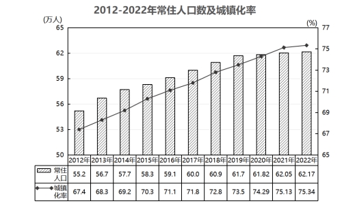 公安戶籍人口為56.88萬人,其中,男性28.32萬人,女性28.56萬人;城鎮(zhèn)人口36.37萬人,鄉(xiāng)村人口20.52萬人。全年出生人口3564人,出生率為6.29‰;死亡人口2418人,死亡率為4.27‰;人口自然增長率為2.02‰。年末總戶數(shù)22.13萬戶,戶均人口2.57人。常住人口62.17萬人,常住人口城鎮(zhèn)化率75.34%。
