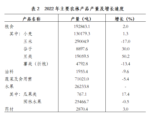 ????在糧食種植面積中,小麥種植面積46.9萬畝,增加0.2萬畝;玉米種植面積9萬畝,減少3.9萬畝;谷子種植面積4.5萬畝,減少0.02萬畝;豆類種植面積11.4萬畝,增加4.2萬畝;薯類種植面積1.6萬畝,減少0.05萬畝。