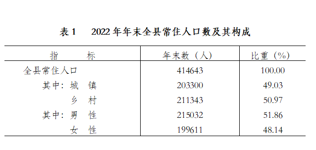 ?????年末全縣常住人口為414643人,比上年末增加227人,其中城鎮(zhèn)常住人口203300人,占常住人口比重為49.03%,比上年末提高0.6 個百分點。全年全縣出生人口3977人,出生率為9.59 ‰;死亡人口4074人,死亡率為9.83 ‰;自然增長率為-0.23 ‰;常住人口性別比為107.73(以女性人口為100)。
