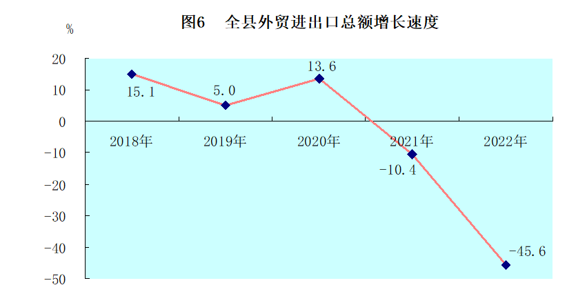 全年全縣海關(guān)進出口總額13.6億元,下降45.6%。其中,出口額0.1億元,增長1.6%;進口額13.4億元,下降45.9%。