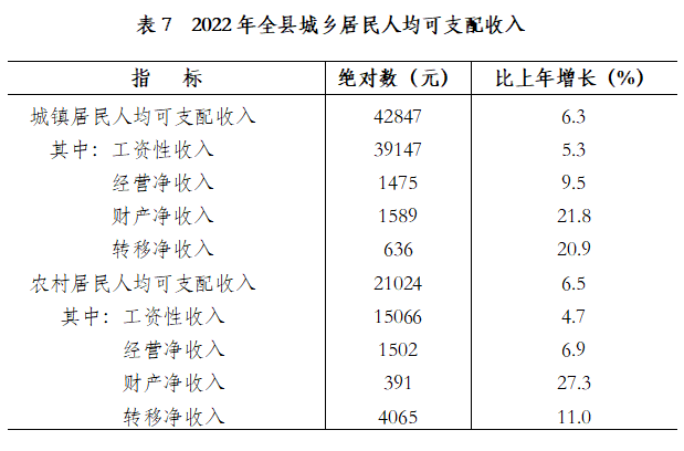 ?全年全縣居民人均可支配收入30081元,增長6.3%。按常住地分,城鎮(zhèn)居民人均可支配收入42847元,增長6.3%;農(nóng)村居民人均可支配收入21024元,增長6.5%。