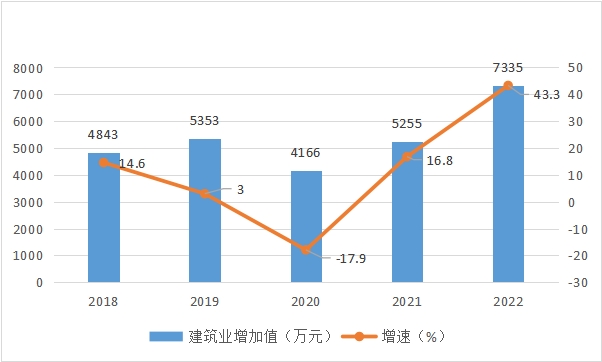 全年建筑業(yè)總產(chǎn)值43737萬元,增長1.1%。增加值7335萬元,增長43.3%。