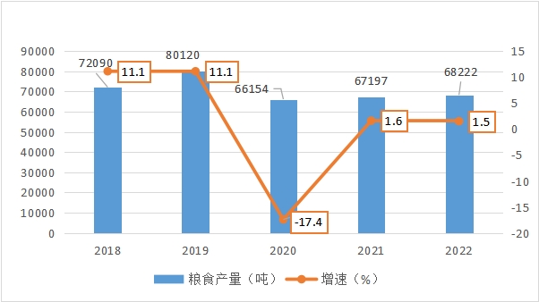 2022年全年糧食種植面積530631.03畝,增長 0.11%。其中,谷物種植面積406884.06畝,增長2.81%;玉米種植面積67300.36畝,增長18.96%。豆類種植面積43644.76畝,下降19.38%。油料種植面積96972.8畝,增長8.75%。蔬菜及菌類種植面積1501.4畝,增長26.19%。