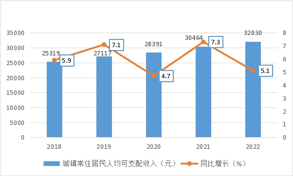 圖:2018-2022年全區(qū)城鎮(zhèn)常住居民人均可支配收入及增速