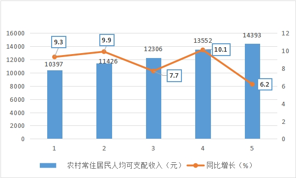 按常住地分,城鎮(zhèn)居民人均可支配收入32030元,增長5.1%。城鎮(zhèn)居民人均可支配收中入工資性收入占比58.54%、經(jīng)營性收入占比15.52%、財(cái)產(chǎn)性凈收入占比6.86%、轉(zhuǎn)移凈收入占比19.09%;農(nóng)村居民人均可支配收入14392元,增長 6.2%。農(nóng)村居民人均可支配收入中,工資性收入占比39.86%、經(jīng)營性收入占比33.85%、財(cái)產(chǎn)性凈收入占比0.34%、轉(zhuǎn)移凈收入占比25.95%。 城鄉(xiāng)居民人均可支配收入比為2.23。