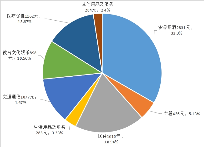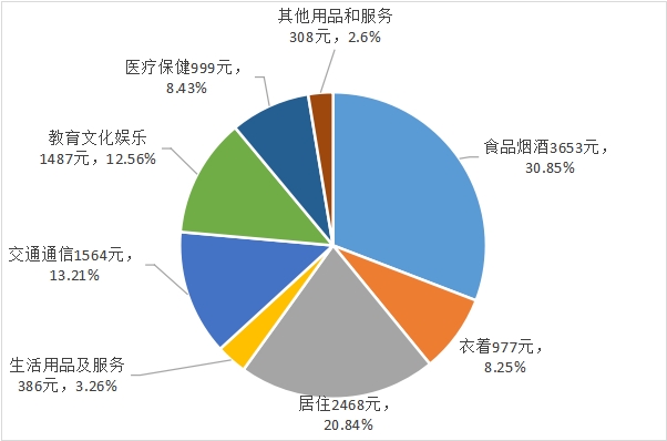 全年全區(qū)居民人均生活消費(fèi)支出11843元,增長1.8%。按支出分類看,食品煙酒支出占比30.85%、衣著消費(fèi)占比8.25%、居住支出占比20.84%、生活用品及服務(wù)支出占比3.26%、交通通信支出占比13.21%、教育文化娛樂支出占比12.56%、醫(yī)療保健支出占比8.44%、其他用品及服務(wù)支出占比2.6%。