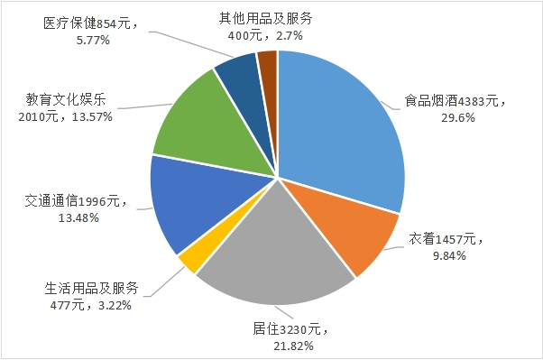 按常住地分,城鎮(zhèn)居民人均生活消費(fèi)支出14806元,下降0.8 % 。按支出分類看,食品煙酒支出占比29.6%、衣著消費(fèi)占比9,84%、居住支出占比21.82%、生活用品及服務(wù)支出占比3.22%、交通通信支出占比13.48%、教育文化娛樂支出占比13.58%、醫(yī)療保健支出占比5.77%、其他用品及服務(wù)支出占比2.7%。農(nóng)村居民人均消費(fèi)支出8502元,增長6.3% 。按支出分類看,食品煙酒支出占比33.3%、衣著消費(fèi)占比5.13%、居住支出占比18.94%、生活用品及服務(wù)支出占比3.33%、交通通信支出占比12.67%、教育文化娛樂支出占比10.56%、醫(yī)療保健支出占比13.67%、其他用品及服務(wù)支出占比2.4%。