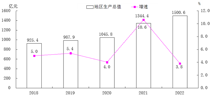 初步核算,2022年全年實現(xiàn)地區(qū)生產(chǎn)總值1500.6億元,按不變價格計算,比上年增長3.8%。其中,第一產(chǎn)業(yè)增加值122.8億元,增長5.6%,占地區(qū)生產(chǎn)總值比重為8.2%;第二產(chǎn)業(yè)增加值794.5億元,增長3.6%,占地區(qū)生產(chǎn)總值比重為52.9%;第三產(chǎn)業(yè)增加值583.3億元,增長3.6%,占地區(qū)生產(chǎn)總值比重為38.9%。人均地區(qū)生產(chǎn)總值56426元,按2022年平均匯率計算為8389美元。