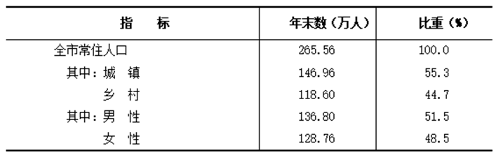 年末全市常住人口265.56萬人,比上年末減少0.76萬人。其中,城鎮(zhèn)常住人口146.96萬人,占常住人口比重為55.34%,比上年末提高0.60個百分點。全年全市出生人口1.70萬人,出生率為6.38‰;死亡人口2.24萬人,死亡率為8.44‰;自然增長率為-2.06‰。