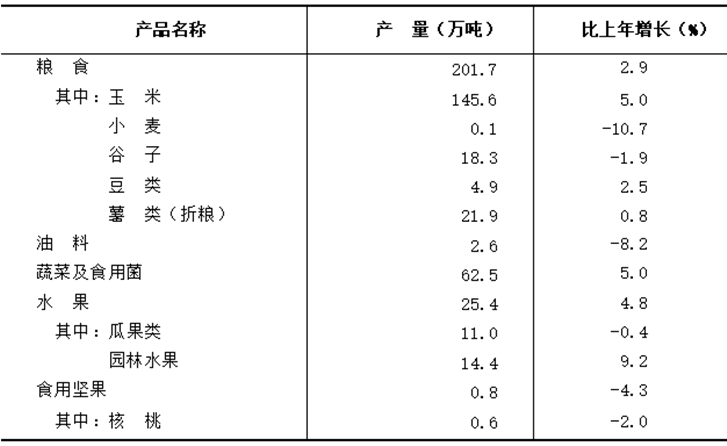 全年全市農(nóng)作物種植面積477.8千公頃,比上年增加0.9千公頃。其中,糧食種植面積429.9千公頃,增加1.0千公頃;油料種植面積15.2千公頃,增加1.7千公頃;中草藥材收獲面積5.0千公頃,減少1.6千公頃;蔬菜種植面積20.3千公頃,增加0.7千公頃。在糧食種植面積中,玉米種植面積224.7千公頃,增加10.0千公頃;小麥種植面積0.2千公頃,減少0.02千公頃。果園面積15.1千公頃,減少0.5千公頃。