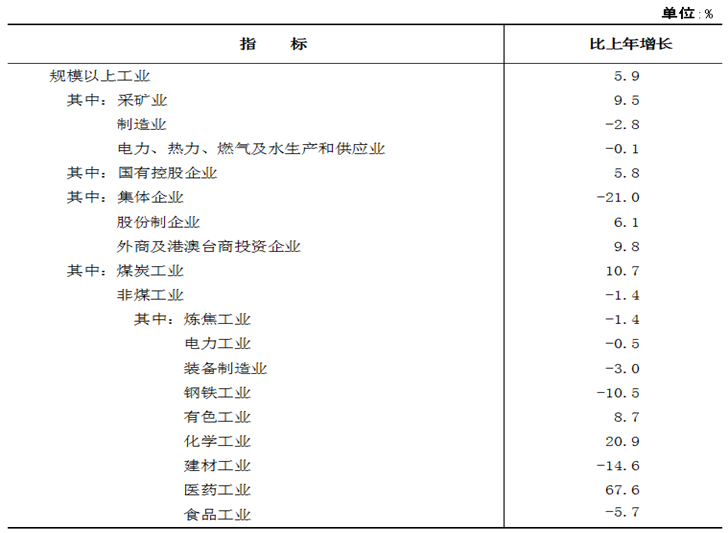 規(guī)模以上工業(yè)增加值增長5.9%。在規(guī)模以上工業(yè)中,分門類看,采礦業(yè)增長9.5%,制造業(yè)下降2.8%,電力、熱力、燃氣及水生產(chǎn)和供應業(yè)下降0.1%;分煤與非煤看,煤炭工業(yè)增長10.7%,非煤工業(yè)下降1.4%。