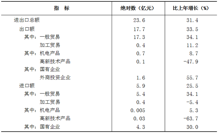 全年全市進出口總額23.6億元,比上年增長31.4%。其中,進口額5.9億元,增長25.5%;出口額17.7億元,增長33.5%。