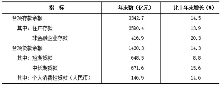 年末全市金融機構(gòu)本外幣各項存款余額3342.7億元,比上年末增長14.5%,比年初增加423.8億元。各項貸款余額1420.3億元,比上年末增長14.3%,比年初增加177.2億元。