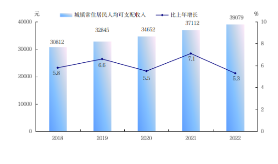 圖5 ??2018-2022年城鎮(zhèn)常住居民人均可支配收入及其增長(zhǎng)速度2022年山西省臨汾市襄汾縣國(guó)民經(jīng)濟(jì)和社會(huì)發(fā)展統(tǒng)計(jì)公報(bào)