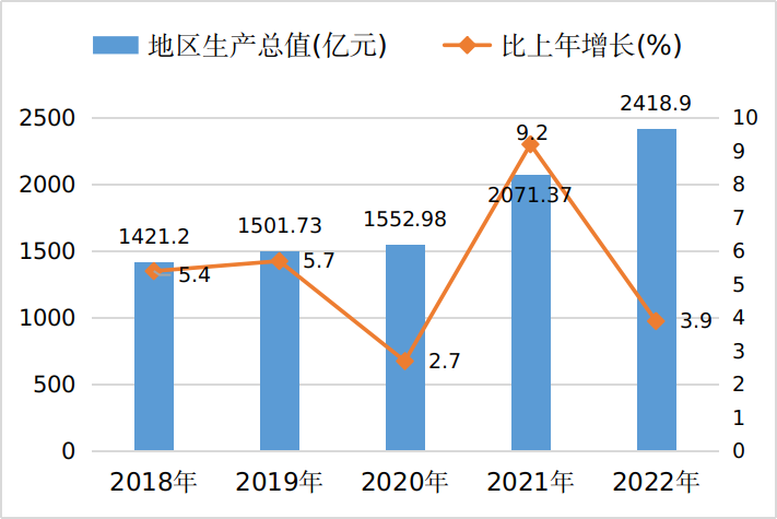 圖1 2018-2022年全市地區(qū)生產(chǎn)總值及其增長(zhǎng)速度